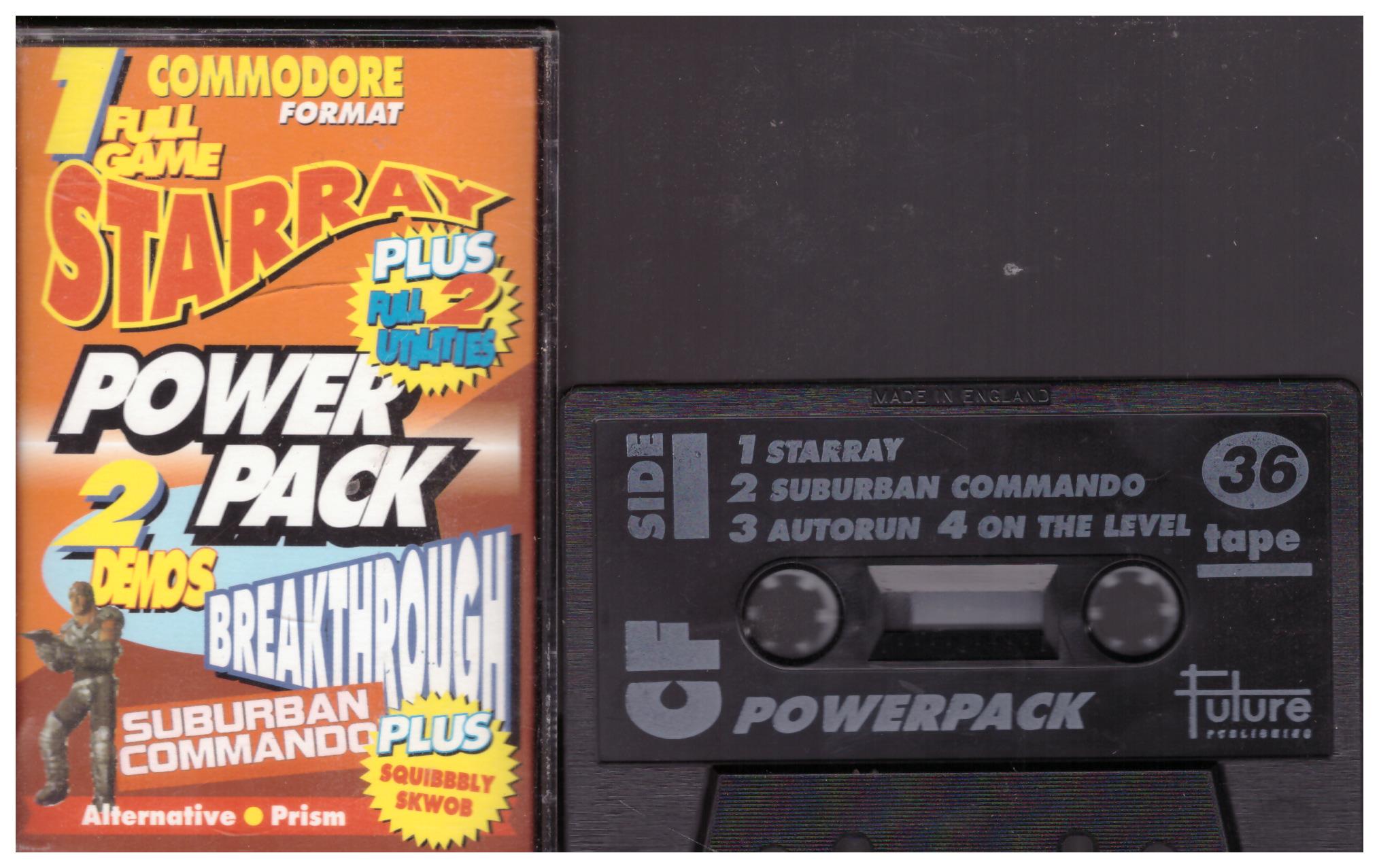 Commodore Format Tape 36 for Commodore 64. 1993 covertape for the magazine Commodore Format that has the following: Starray full game, Suburban Commando demo, Breakthrough demo, Autorun utility, Flashload utility and Squibbly Skoob reader game. Complete in case. No magazine included. Excellent condition. Tape is tested and working.